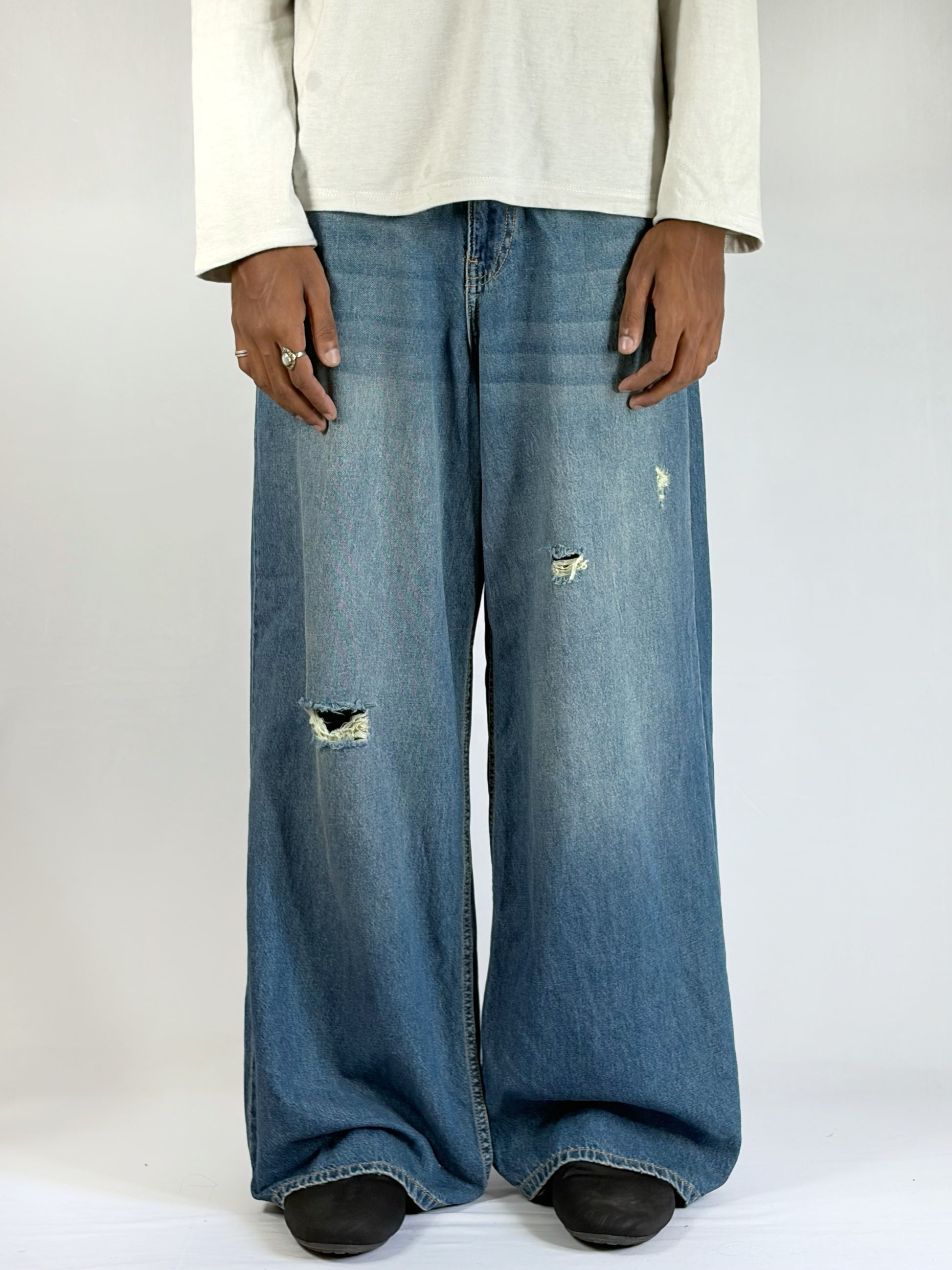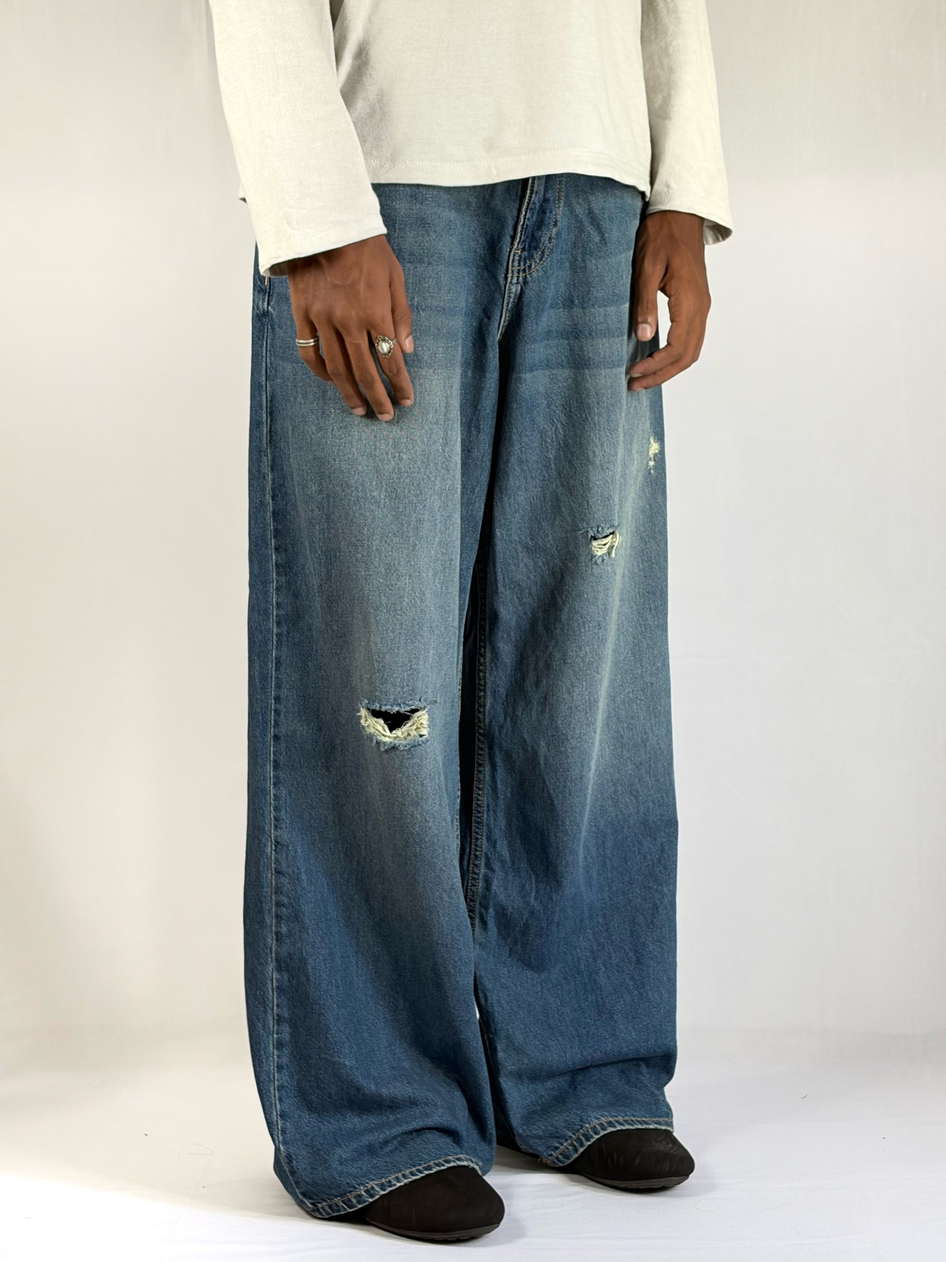 MINT SCRATCH WIDE pant is a bold denim statement piece designed for those who love relaxed silhouettes with an edgy twist. Featuring a wide-leg cut and a cool-toned faded wash, it delivers a modern streetwear vibe while maintaining a laid-back, comfortable fit. The distressed scratch details add a rugged, worn-in character that enhances its unique style and gives it a standout personality. Crafted for both comfort and visual impact, this pant pairs effortlessly with minimal tops or layered outfits, making it a versatile essential for confident, trend-forward looks.